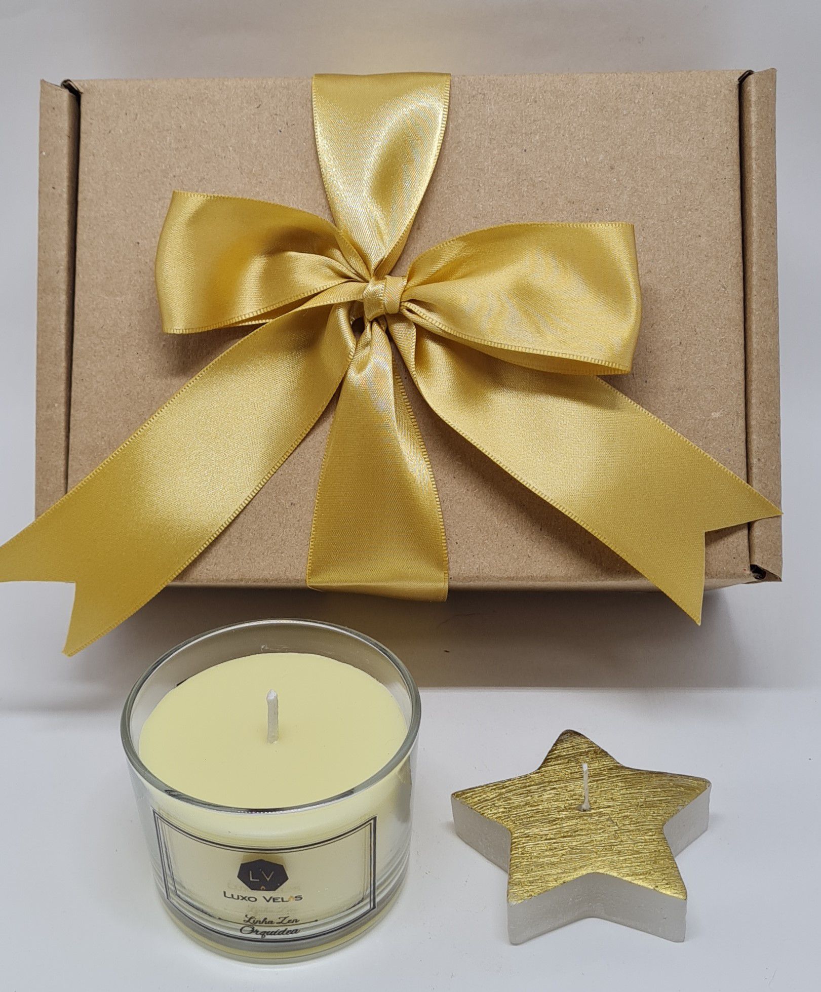 Caixa de Presente com Vela feita de cera vegetal e essência de orquidea, companha uma vela estrela dourada.